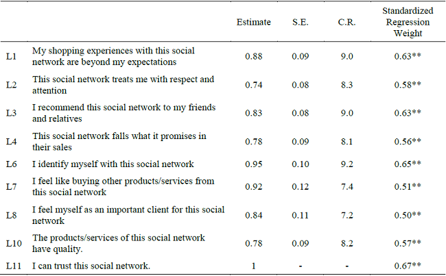 Pursuant to Hair et al. (2009), factor loadings must be higher than 0.5. The items L5 (This social network is fast in problem solutions), L9 (The advertisements of this social network is in line with its offers), L12 (This social network offers me personalized service), L13 (This social network's prices are fair) and L14 (This social network is the best option when compared to its competitors) achieved loadings under 0.5. For this reason, they were taken out of the analysis.