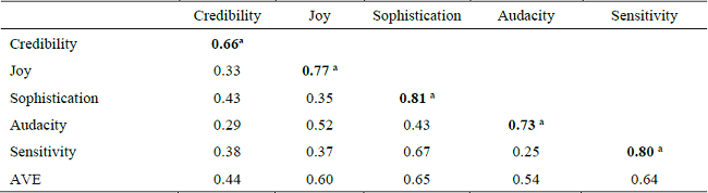 The next step concerned verifying the convergent and discriminant validity of brand personality scale. Regarding convergent validity, Table 1 shows that most items have a standardized estimative over 0.50, as recommended by Hair et al. (2009). Besides, Jöreskog's rho was higher than 0.7 for all dimensions (Credibility=0.86; Joy=0.91; Sophistication=0.90; Audacity=0.82; Sensitivity=0.87). Therefore, convergent validity was confirmed.