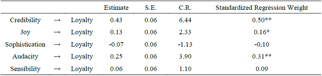 Table 4 shows that Credibility, Joy and Audacity significantly predict consumer loyalty. It is important to mention that brand personalities Sophistication (p-value=0.25) and Sensitivity (p-value=0.27) were not significant in the explanation of loyalty to a social network. This means that characteristics such as chic, fancy, glamorous or romantic do not interfere in consumer loyalty to social media.