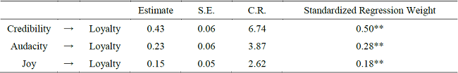 From the data on Table 5, we observe that Credibility, Audacity and Joy were significant in loyalty prediction, with Credibility being strongest (ß=0.50). Standardized coefficients or beta coefficients (β) enable the comparison between coefficient and dependent variable, revealing the magnitude and the direction of the relationship between predictors and the dependent variables (Hair, Black, Babin, Anderson, & Tatham, 2009). Also, the model had a R2 of 56%, which means that 56% of customer loyalty in the context of social networks as brands can be explained by brand personality; more specifically, by Credibility, Audacity and Joy dimensions.