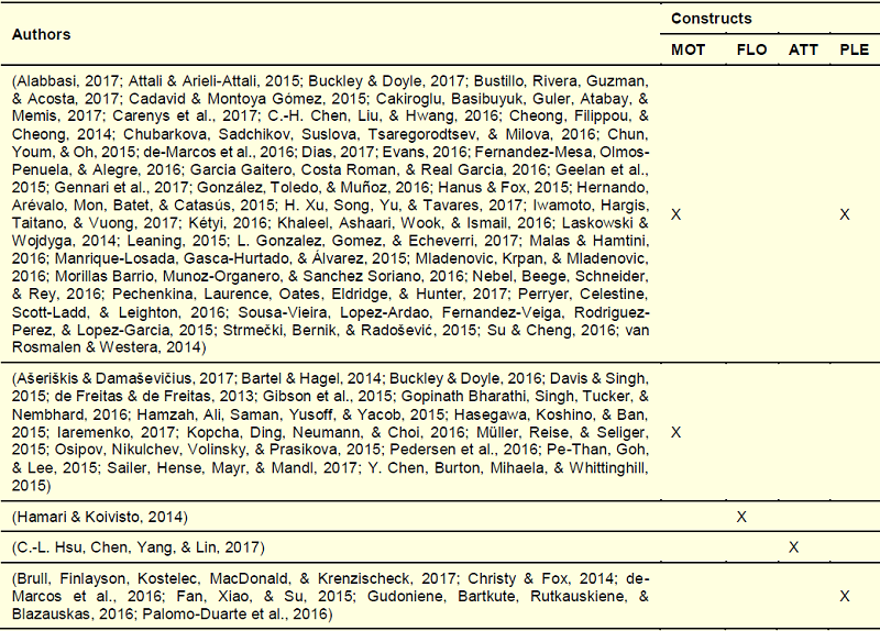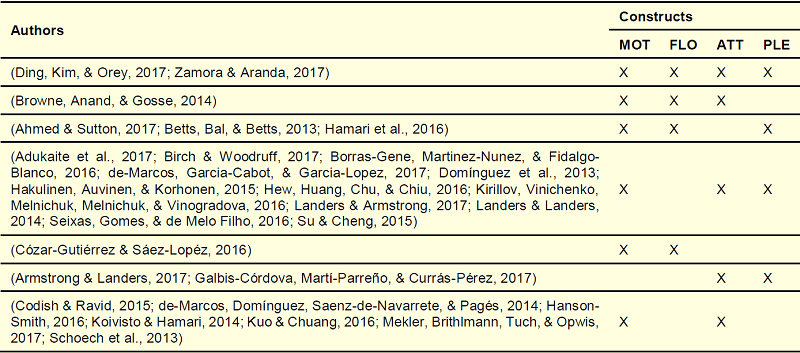 Most of the relationships that were observed were statistically relevant, and most empirical articles show the following main relationships: motivation has a positive influence on perceived learning (Attali & Arieli-Attali, 2015; Buckley & Doyle, 2017; C.-H. Chen et al., 2016; de-Marcos et al., 2016; Filsecker & Hickey, 2014; Gennari et al., 2017; Hanus & Fox, 2015; Ibanez, Di-Serio, & Delgado-Kloos, 2014; Simões et al., 2013), attitudes (Codish & Ravid, 2015; Domínguez et al., 2014; Hanson-Smith, 2016; Koivisto & Hamari, 2014; Kuo & Chuang, 2016; Mekler et al., 2017; Schoech et al., 2013), and flow (Ahmed & Sutton, 2017; Betts et al., 2013; Browne et al., 2014; Cózar-Gutiérrez & Sáez-López, 2016; Ding et al., 2017; Hamari et al., 2016). In turn, flow has a positive influence on perceived learning (Ahmed & Sutton, 2017; Betts et al., 2013; Hamari et al., 2016), attitudes (Browne et al., 2014; Ding et al., 2017; Zamora & Aranda, 2017), and motivation (Ahmed & Sutton, 2017; Betts et al., 2013; Browne et al., 2014; Hamari et al., 2016). Finally, attitudes have a positive influence on perceived learning (Adukaite et al., 2017; Armstrong & Landers, 2017; Birch & Woodruff, 2017; Borras-Gene et al., 2016; Cózar-Gutiérrez & Sáez-López, 2016; de-Marcos et al., 2017; Galbis-Córdova et al., 2017; Hew et al., 2016; Landers & Armstrong, 2017).