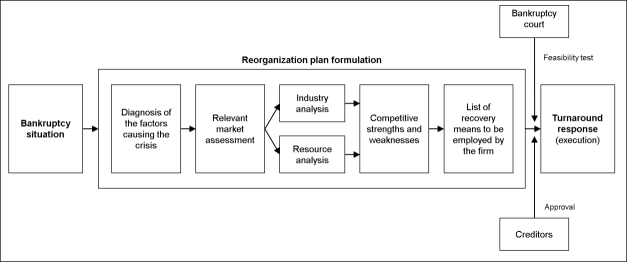 Considering these two stages of the turnaround process, Pearce and DiLullo (1998) argue in favor of a strategic plan that openly incorporates the possibility of firm bankruptcy (see also Flynn & Farid, 1991; Moulton & Thomas, 1993). According to Pearce and DiLullo (1998), the possibility of bankruptcy can be explicitly incorporated into the strategic planning of a firm when one contemplates the turnaround situation as a potential bankruptcy situation. Based on this argument, our basic claim in this paper is that the inclusion of a strategic planning exercise into the turnaround stage sheds light on another stage so far disregarded in the majority of turnaround discussions: the stage of reorganization plan formulation. In line with most statutory schemes, the plan must be accepted by the majority of creditors, and the plan’s feasibility must be confirmed by the bankruptcy court. Thus, the reorganization plan is a key element of the turnaround process when it involves bankruptcy protection. The plan formulation phase takes place after the bankruptcy situation and precedes the turnaround response (see Figure 1).