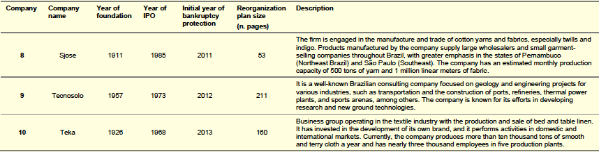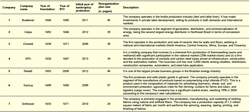 We selected 10 companies that have shares traded in Brazil’s stock exchange and went through bankruptcy reorganization supported by Law 11,101 (see Table 1). All companies have long been in operation, some of them centuries old. Most companies went public in the twentieth century. Firms have operations in various industries, particularly the textile and energy industries. They have regional, national, and international operations.