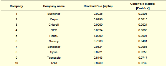 (Rihoux & Ragin, 2009, p. 90). A fuzzy set does not merely rank cases comparatively; it varies the degree of full inclusion or full exclusion of a particular case in a group. Accordingly, we use fuzzy- set QCA (fsQCA) to account for the dispersion of conditions between fully-in and fully-out. The logic behind the fsQCA is similar to the crisp-set QCA. To perform the analysis, we used the Direct Method of Calibration over our raw database to guarantee the correct estimation of conditions into the fully-in, partially-in, partially-out, and fully-out spectrum. Table 5 shows the final calibrated table, i.e., the final quality indexes for each dimension of each company analyzed.