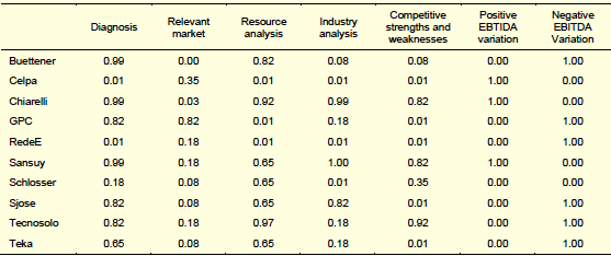 Accordingly, a positive EBITDA (solution 1) is associated with the presence of almost all strategic components combined. A successful result will be reached if the firm has a clear diagnosis of the crises, performed an adequate resource and industry analysis, and clearly identified its competitive strengths and weaknesses. Surprisingly, the clear identification of the firm’s relevant market was negligible and appeared to be absent for a positive outcome. Meanwhile, for a negative EBITDA (solutions 2a and 2b), the main message is even more straightforward. The company may have made a perfect diagnosis and may even have included a resource assessment in the plan; however, if the firm has not performed a satisfactory industry analysis, the recovery plan is bound to fail. In light of this evidence, we performed a necessity analysis (see Table 9) to check whether the absence of the industry analysis is a necessary condition for a reorganization plan to fail. We found evidence that the absence of the industry analysis is “more often than not” associated with a negative EBITDA (p <0.1).