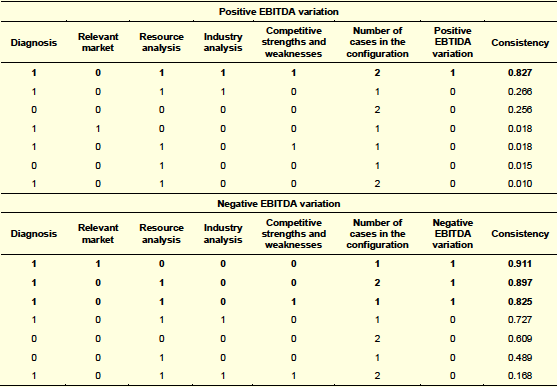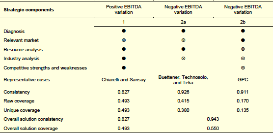 We report in Table 8 the QCA results. The estimations are based on the quality rankings of the plans’ components. The table shows that not just one but two configurations are associated to a negative EBITDA variation. In the case of a positive EBITDA variation, there is one configuration. For each configuration (solution), a different pattern of present and absent strategic components exists.