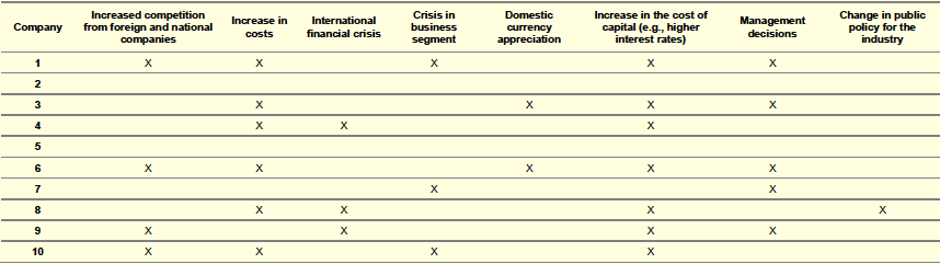 Table 7 presents the key elements listed by companies in their reorganization plans as causing the problems they face. In general, firms associate the origin of their problems with the rising cost of capital, either due to an increase in interest rates by the Brazilian Central Bank or due to the deterioration of their own financial conditions. Another element cited repeatedly by companies is the rise in production costs through, for example, the abrupt increase in prices of raw materials. Increased competition and the influence of the instability caused by global financial crisis are also mentioned. Some companies attribute their crisis to the fragility of their management processes, which fail to meet the external contingencies.