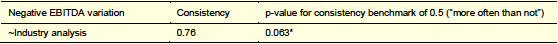 To create our indicator, we calculated the ratio of the average EBITDA for each company, taking as a reference the periods before and after the bankruptcy6. The period before bankruptcy refers to the three years immediately preceding the bankruptcy of the company. We calculated the three- year average EBITDA because companies that are about to go bankrupt usually have sharp fluctuations in financial indicators. Thus, the average corrects any seasonality or abrupt movements of the indicators7. For the period after the bankruptcy, we calculated the average EBITDA considering the period initiating after the two-year reorganization bankruptcy period because it is the time provided by law for the recovery of the company. For the calculation of this average, the period considered varies from one to three years, depending on the availability of data (which depends on the initial year of bankruptcy protection). When calculating the EBTIDA ratio, we applied the modulus in the denominator. This is a simplification of the normalized earnings approach (Damodaran, 2001), which ensures the identification of the actual improvement or worsening of the financial condition of the firm. The results are shown in the last column in Table 4.