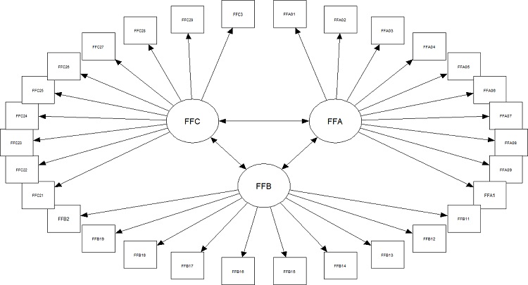 The Feeling of Fatigue scale (Yoshitake, 1971) is composed of three constructs (latent variables), each with 10 items measuring the presence of fatigue symptoms: FFA01-10 (drowsiness and dullness), FFB11-20 (lack of ability to concentrate), and FFC21-30 (projection of physical discomfort). The scores of the three latent variables (A, B, and C) are referred to as feelings of fatigue A, B, and C, denoted FFA, FFB, and FFC, respectively. The overall score of the 30 items is denoted FFS. Figure 1 depicts the instrument structure. Table 1 shows the instrument together with a proposed symptoms checklist in English (Yoshitake, 1971) and the translated version in Portuguese (Fisher, 1990) used in Brazil since 1990 by several studies, as outlined in section ‘Subjective measures of fatigue’. Each indicator is assessed on a Likert scale with values ranging from 1 to 5, where respondents answer the question ‘how often do you present the following symptoms?’ by choosing one of the following alternatives: ‘never,’ ‘rarely,’ ‘sometimes,’ ‘many times,’ or ‘always.’