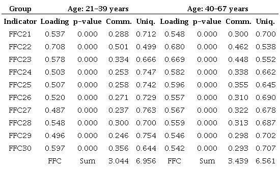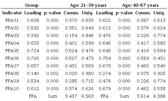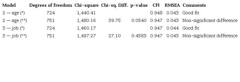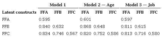 Finally, cross-validation between groups with the final measurement model was performed only for groups with significant differences on mean comparisons (Table 3). The following models were evaluated: Model 1 - all available data; Model 2 - age group comparison; Model 3 - job group comparisons. First, a loose cross-validation (Hair et al., 2009) was applied in order to check measurement invariance of latent variable correlations, loadings, and error variances. Table 6 shows similar correlations between latent variables for Models 1, 2, and 3. Tables 7, 8, and 9 show comparisons of loadings and error variances (uniqueness) for latent variables (FFA, FFB, and FFC), respectively. In Table 7, similar loadings result in similar average variance extracted (AVE), representing the sum of communalities divided by 10. Error variances (uniqueness) were also similar. In Table 8, similar loadings and error variances were also obtained. As results proved similar in Table 9, a loose cross-validation was shown.