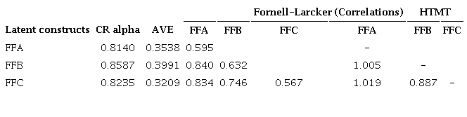The final stage involved the assessment of discriminant validity among the three constructs (FFA, FFB, and FFC). Composite reliability (CR) derived from coefficient alpha. Average variance extracted (AVE) and correlations among the three constructs were measured to evaluate Fornell-Larcker criterion (Fornell & Larcker, 1981) and compare Heterotrait-Monotrait (HTMT) criterion (Voorhees et al., 2016) against the cut-off of 0.85 (Table 11).