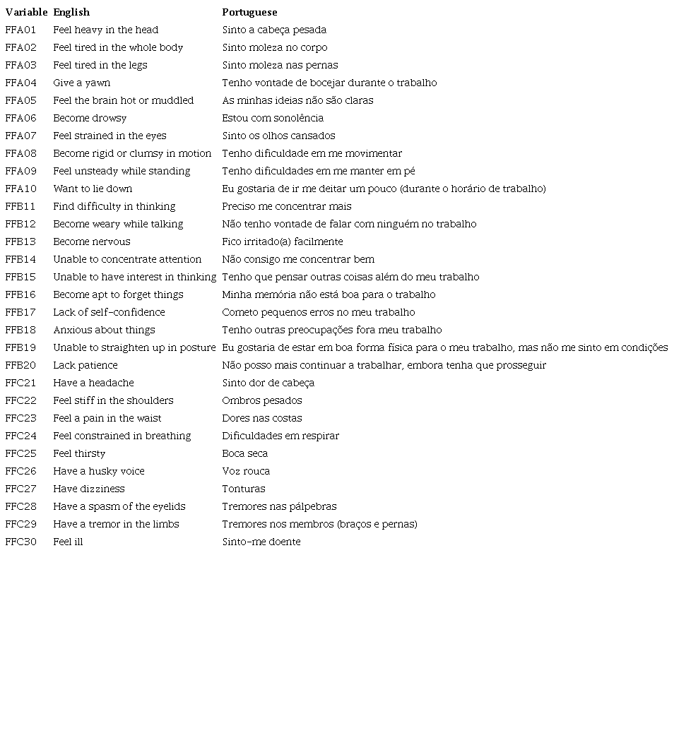 The internal structure of the three-factor Feeling of Fatigue scale was validated originally in Japan (Saito, 1982) among railway workers. The workers were assessed before and after work shifts for different schedules. Results showed that B symptoms were also associated with motivation. The content of the Feeling of Fatigue scale has been validated for use in Latin America (Almirall & Reyes, 1982), where it has been consistently applied (Barrientos-Gutierrez, Martinez-Alcantara, & Mendez-Ramirez, 2004; Parody, Viloria, Hernandez, Niño, & Cervera, 2020). In the 1990s, Prof. Dr. Frida Fischer translated the Feeling of Fatigue scale into Brazilian Portuguese as part of her habilitation thesis (Privatdozent German Degree) (Fischer, 1990). Although the version was not formally validated, it has since been used in Brazil for several studies on fatigue at work (Metzner & Fischer, 2001; Metzner, Fischer, & Nogueira, 2008; Vasconcelos, Fischer, Reis, & Moreno, 2011).