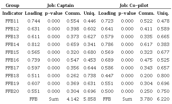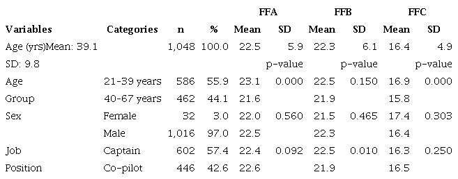 The relevant variables for the final sample of 1,048 pilots are described in Table 3, with the analysis of variance indicating significant mean differences between groups (p-value < 0.05).
