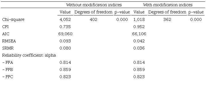 Table 5 compares fit measures and reliability before and after inclusion of modification indices. Adequate fit measures and reliability were obtained for the measurement model. Although the chi-square statistics remained non-significant, the other quality indices (CFI, RMSEA, SRMR) presented satisfactory results. The model incorporating modification indices had the best parsimony (AIC). In addition, the coefficient alpha values confirmed the reliability and internal consistency of the instrument. Therefore, these results confirm the convergent validation of the internal structure.