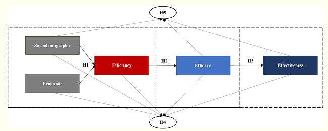 H5: There is a positive and significant correlation between the sociodemographic conditions and efficacy, and between sociodemographic conditions and effectiveness, at the basic level of education in Brazilian municipalities (Fabrino et al., 2014).