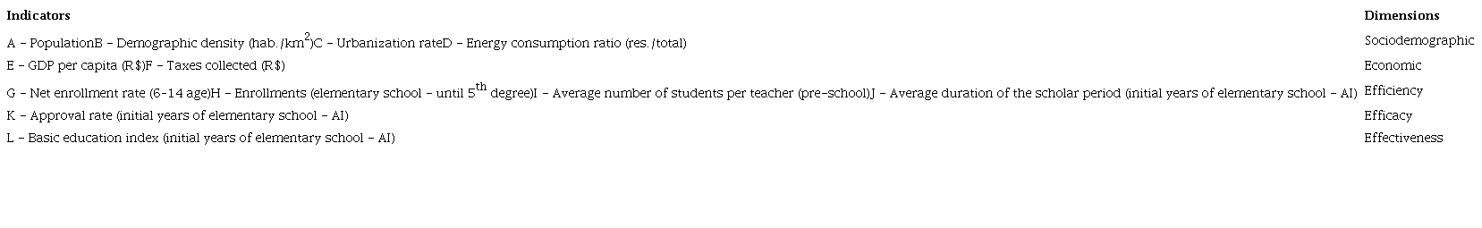 The indicators and dimensions constitute the inputs, outputs, and outcomes of the first elementary level in public schools in São Paulo State municipalities and the possible relationships among these. Therefore, we used dependent variables to provide a better explanation of the concept, such as efficiency, efficacy, and effectiveness.