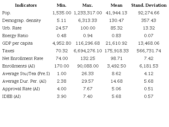 Nevertheless, a high mean is seen for the two socioeconomic indicators, two efficiency indicators, and the effectiveness indicators. The GDP per capita (21,610.92), the energy consumption ratio (0.83), the number of students per teacher (8.62), and the average duration period (14.68) are higher than the national mean (IBGE 2010; Inep, 2019). The average of the effectiveness indicator Ideb-AI (5.68) is above the Ideb-AI national goal of 3.8; 4.2 and 4.5. (Inep, 2019).