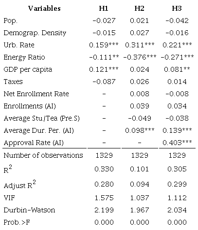 Finally, the third model with R2 of 0.305 and adjusted R2 of 0.299 best explains the results. Thus, hypothesis 3 is partially supported: a more effective model can be provided by better socioeconomic, efficiency, and efficacy indicators at the primary education level (Si & Qiao, 2017). The third model shows a positive and statistically significant level at 0.001 for the rate of urbanization coefficients (0.221***), the average duration of the school period (0.139***), and the approval rate (0.403***), and at 0.05 for the GDP coefficient per capita (0.081**). There is also a negative and statistically significant level of 0.001 for the coefficient of residential energy ratio (-0.271***).