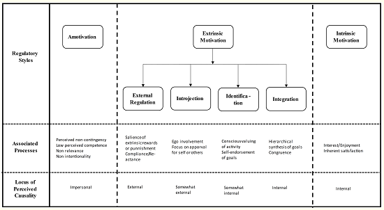 Motivation may vary from an amotivated state to a motivated state. Lack of motivation may emerge from not recognizing the value in an activity (Ryan, 1995), disbelief that the activity will lead to the desired outcome (Seligman, 1975), or not feeling sufficiently competent to perform the activity (Deci, 1976). Ryan and Deci’s (2000a) taxonomy presented various motivation types, reflecting different degrees of autonomy or self-determination considering extrinsic motivation. Extrinsic motivation is classified according to the self-regulation style. Self-regulation depends on how people assimilate social values and extrinsic contingencies. Depending on this, people may transform personal values and self-motivations. The regulatory styles of extrinsic motivation are: external regulation, when an activity is performed to satisfy an external demand or to obtain an external reward; introjected regulation, when an activity is performed under pressure to avoid guilt or anxiety, due to egotism and pride; identification, when an activity is performed because it is considered important; and integrated regulation, when it is related to values and needs considered important (almost intrinsic motivation).