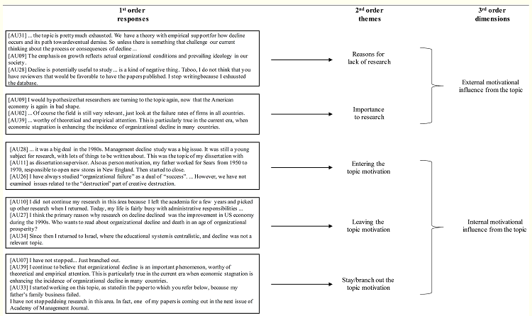 Through an iterative process of analyzing the responses and the literature, we proposed an emergent process model of problem choice. To derive this model from the authors’ responses, we organized them into a first-order group based on their similarities (first-order responses in Figure 2). These responses were related to the motivation to adopt or abandon the topic, and to the external influences related to the importance of researching the topic, or the reasons why the topic lacks research (second-order theme in Figure 2). These motivations were internal and external (third-order dimensions in Figure 2).