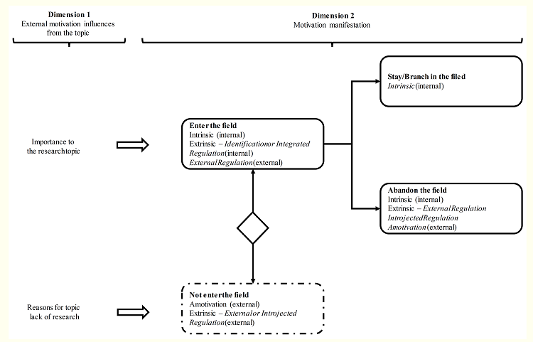 On the left side of our framework (Figure 3), we identified motivations to undertake or not to undertake the topic. Motivation not to undertake is usually due to amotivation, lack of interest, or not believing that the results could be achieved. It is also due to extrinsic factors that undermine motivation. In this case, these factors were ‘external regulation’ or ‘introjected regulation’ factors, such as lack of funding (Miller & Neff, 2013) and access to data, or research far from the mainstream (Doh, 2015; Hambrick, 2007). However, this is related to the perception of the actual researchers of the topic. It should be confirmed through researchers that decide not to undertake research.