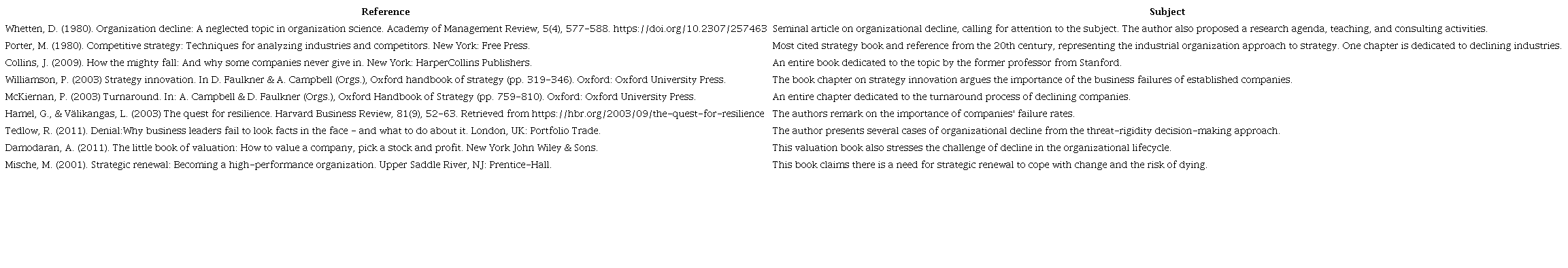 The empirical setting for the study was composed of researchers that entered, and then remained in or abandoned a field of study (or research topic). To understand the researchers’ motivations for adopting or abandoning a research topic we selected the research topic of organizational decline, which has been acknowledged as an important phenomenon to study (Collins, 2009; Damodaran, 2011; Hamel, 2012; McMillan & Overall, 2017; Whetten, 1980). Organizational decline investigates the causes, effects, and actions related to declining organizational performance. Despite being an important topic (additional references in Table 1), with important gaps to research and possible contributions that would differ from the dominant research approaches, it has remained under-researched (Serra et al., 2013; Whetten, 1980).