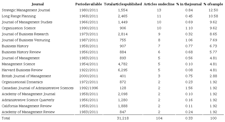 To determine the extent to which organizational decline has been studied, we searched 18 leading business/management journals (Harzing, 2010) to collect the articles published on the topic and retrieve information on their authors. All of the journals were considered top journals according to the Brazilian Qualis criteria for Business Administration. The journals were searched using the ISI Web of Knowledge based on three main procedures. First, we selected the journals. Second, we defined a set of fifteen keywords that were used to search each journal using the ‘topic’ option in the ISI Web of Knowledge portal. This option enables a search of the titles, abstracts, and keywords of the articles. The following keywords were selected considering previous articles published on organizational decline in a prior exploratory research using only organizational decline: decline, organizational decline, performance decline, decay, strategy decay, performance decay, organizational decay, bankruptcy, failure, business failure, organizational failure, turnaround, retrenchment, longevity, and life cycle. Finally, for each article identified we analyzed at least the title and abstract to ensure that the content of the article served our purpose. From the articles identified on decline, we composed a sample of possible scholars to survey.