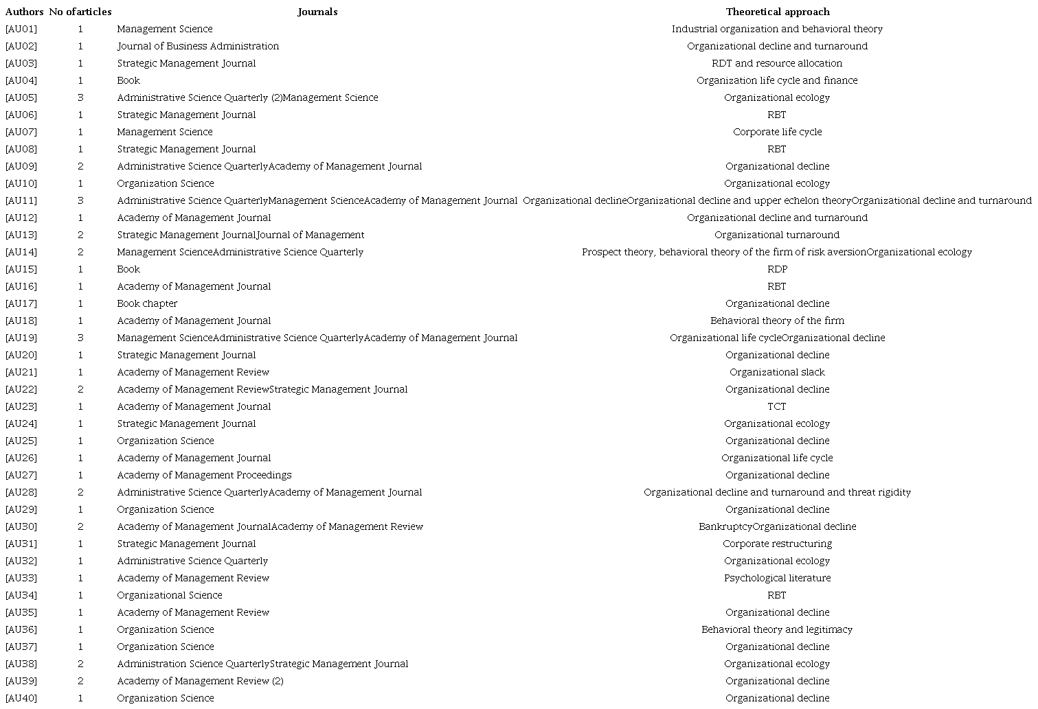The survey was conducted by email and sent to the 132 authors that (co)authored at least one of the papers. Forty scholars responded, who had (co)authored 48 of the 104 articles that were selected. Their responses were the object of our analyses (Table 3). The scholars have distinct research focuses, but some of them are strictly dedicated to the research of the organizational decline phenomenon. This difference in approach enabled us to compare their responses and triangulate our findings. To complement this process, we also examined the public curriculum vitae of each author to identify any interruptions and/or changes in their research subject.