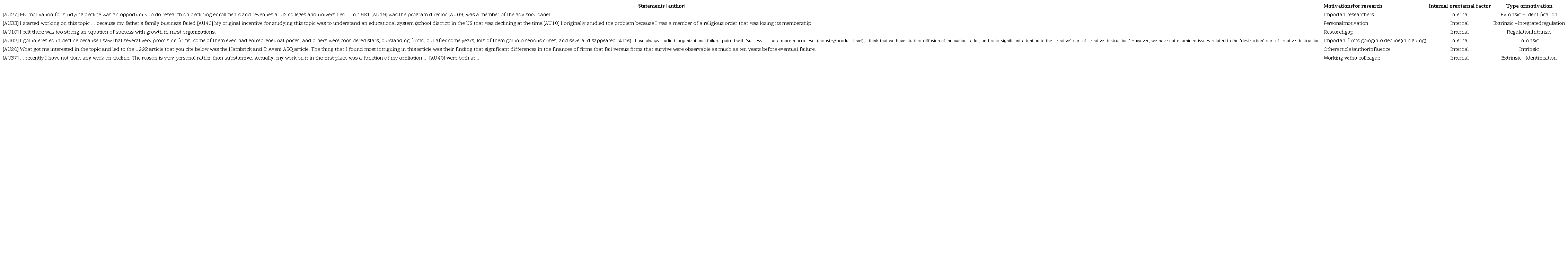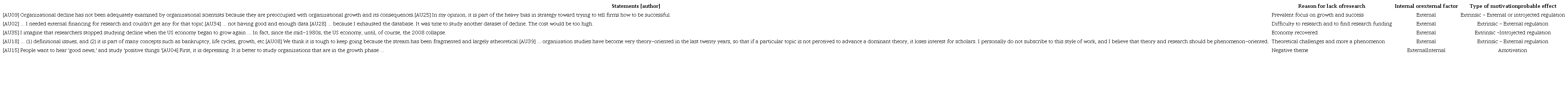 What were the initial motivations to undertake this research topic, given the hazards of data collection and treatment and the difficulties involved in publishing in top journals? Understanding motivations to undertake a topic of research may enlighten us as to how to promote additional research in difficult and challenging fields. Table 6 shows a sample of responses from the participants. It is worth noting that some scholars were actually interested in other topics, with organizational decline merely being a complementary perspective.