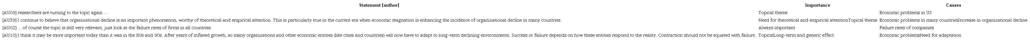 In analyzing the responses, we resorted extensively to excerpts from the interviews. First, we demonstrated the importance of the topic (organizational decline) and causes and effects, considering the specialists’ experience. Second, we scrutinized why organizational decline has been an under-researched topic in organization studies from the perspective of the experts. Third, we assessed the scholars’ motivations for studying decline.
