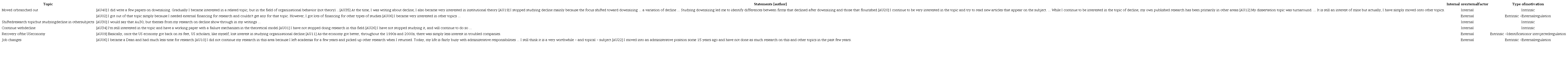 Table 4 includes additional statements. It is worth noting that regardless of the reasons, the majority of the participants agreed that this is an understudied topic. The most frequently presented rationales included such issues as focusing on decline being unattractive to funding agencies, difficulty in gaining recognition, and the topic being less attractive than targeting successful companies (which everyone else is studying). Other issues included difficulty in accessing data and methodologies. The fact is that standard databases, news, and broad reliable data on organizational decline are not available.