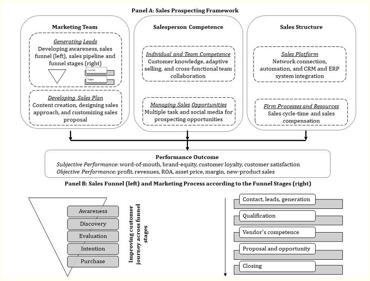 Following sales literature, sales management refers to firm’s sales operations that include managing salespeople and their managers, implementing technology tools to assist multiple activities, such as delivering, ordering, and managing customer account (Weitz & Bradford, 1999). As part of sales management, sales prospecting focuses on initiating and developing new lead and moving on to a qualified prospect, designing the sales proposal, dealing with objections, and closing the sales opportunity (Sabnis, Chatterjee, Grewal, & Lilien, 2013). By revising previous sales research and empirical evidence, we identified three key elements to propose the sales prospecting framework (Figure 1, Panel A). The three elements stress the importance of the marketing team (e.g., leads and sales plan), salesperson particular prospecting competence (e.g., individual and team competencies), and sales structure (e.g., sales platform, ERP, CRM, and firm process). Our ultimate goal is to present how these elements are important for sales prospecting and how they are related to sales performance.