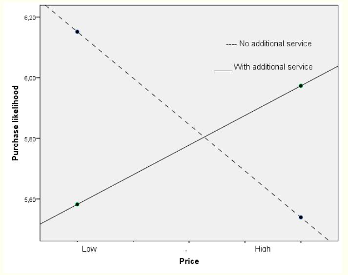 The direct effect of service on the likelihood of purchasing an REVB is also negative and not significant (b = -0.0679, se = 0.2555, t = -0.2656, p = 0.7910). This reveals that purchase likelihood is higher when the service level is low, but not significant. Table 1 also shows that the effect of the interaction between price and service on the likelihood of purchasing an REVB is positive and partially significant (b = 1.0036, se = 0.998, t = 1.9584, p = 0.0526). Thus, we found partial support for H2. Figure 2 illustrates the interaction effects. Purchase likelihood decreases when price is high and there is no additional service, while purchase likelihood increases when price is low and there are additional services.