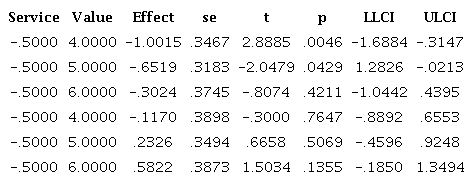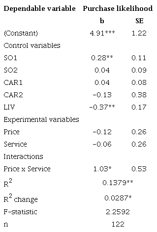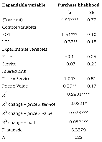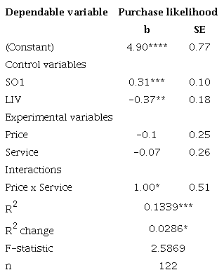 Table 2 shows the results of the interaction between price and service on the likelihood of purchasing an REVB and the moderation effect of perceived value. Unlike what was observed previously, price has a negative and significant direct effect on the likelihood of purchasing an REVB (b = -1.9576, se = 0.8692, t = -2.2521, p = 0.0262). Service, however, still has no significant direct effect on REVB.
