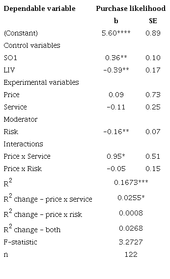 Table 4 shows the results of the interaction between price and service on the likelihood of purchasing an REVB and the moderation effect of perceived risk. Price and service have no significant direct effect on the likelihood of purchasing an REVB. Table 4 also shows that the effect of the interaction between price and service on the likelihood of purchasing an REVB is positive and partially significant (b = 0.9489, se = 0.5081, t = 1.8676, p = 0.0644). Perceived risk has a negative and significant direct effect on the likelihood of purchasing an REVB (b = -0.1567, se = 0.0748, t = -2.0959, p = 0.0383). This reveals that purchase likelihood is low when the REVB is perceived as being an inferior performance option compared to a new battery. Table 5 also shows that perceived risk does not moderate the effect of price on REVB purchase (p = 0.7984). Thus, we found no support for H4.