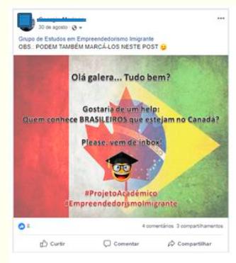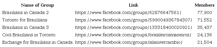 The sample was obtained by convenience (not probabilistic), defined by its accessibility. The researchers, based on the work of Baltar and Icart (2013), used Facebook groups to send the survey questionnaire to the respondents. Some strategies were used to minimize bias in responses: researchers enrolled in 81 Facebook Brazilian groups in Canada, totaling 518,195 members. It is noteworthy that not all members of these groups were Brazilians residing in Canada, because some postings revealed many members interested in immigrating or simply sympathetic to the idea of immigration. Table 1 presents the five largest groups.