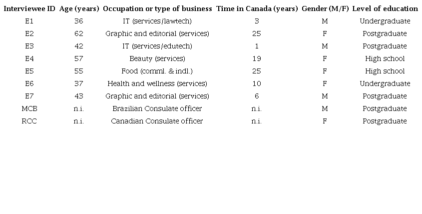 Additionally, with a view to deepening the understanding of Brazilian immigration to Canada and the EI of subjects, seven face-to-face, semi-structured interviews were conducted, entirely recorded and later fully transcribed. Interviewees were named E1 to E7. Excerpts from selected interviews are included in the results section. In addition, a face-to-face interview was also conducted with an officer from the Brazilian consulate in Toronto, here called MCB, and an officer of the Canadian consulate, here called RCC. The interviews took about one hour each and were held according to the schedule and location convenience of the subjects. The main use of these eight additional interviews was to illustrate and/or deepen knowledge regarding the EI and/or their venturing background in Canada.