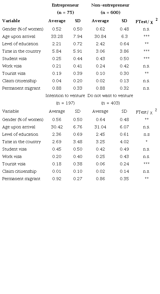 The sample shows a balance between the number of men and women who are entrepreneurs (52%); however, there is a higher prevalence of non-entrepreneurial women (64%). The average age is higher for entrepreneurs, as is time in the country. Among non-entrepreneurs, only in Canada, it is observed that those with EI usually have less time in the country (2.69 years). Among respondents who are not entrepreneurs yet, those who intend to do so in the future far outnumber those who do not intend to do it. Table 3 presents the descriptive statistics of the samples, including sociodemographic and other situational variables’ averages and standard deviation.
