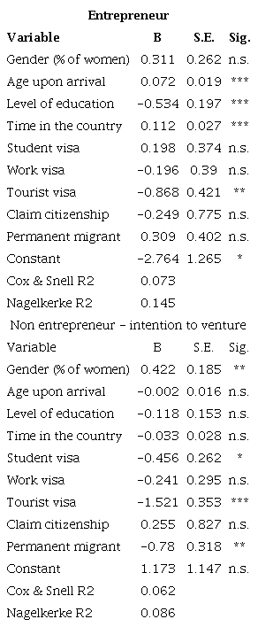 Of the hypotheses proposed, the results effectively point to some variables having a positive influence on EI; these include gender (being a female) and all visa statuses. Of the entrepreneurs, age upon arrival was a significant predictor, while variables such as the level of education, time in the country, and tourist visa had a negative influence.
