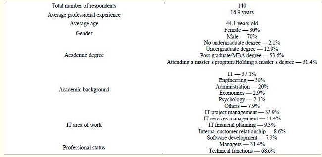 The average professional experience of the 140 respondents was 16.9 years and their average age was 44.1 years old. Marchisotti (2014), in research on the social representation of cloud computing according to IT professionals, found similar values, namely 15 years for the average professional experience and 40 years old for the average age of the respondents.