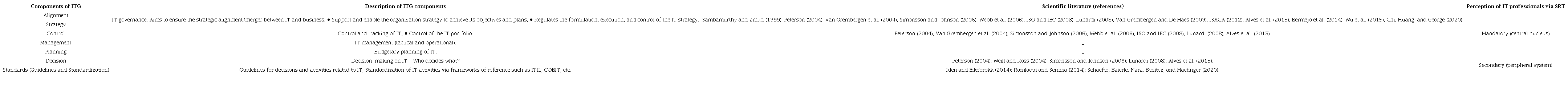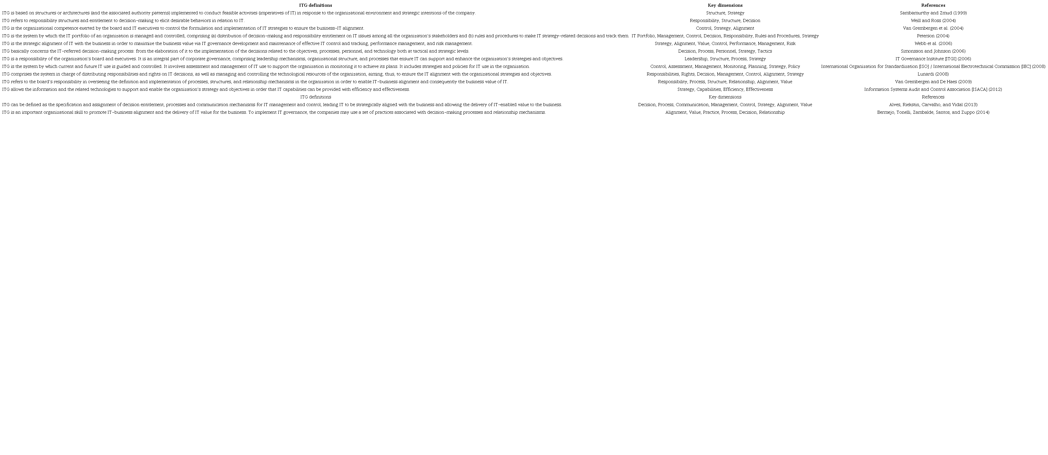 As can be seen, the ITG construct encompasses sundry dimensions raised by several academics. Thus, it is important to investigate whether these ITG dimensions are recognized by IT professionals involved with IT governance in their companies, which will be seen below.