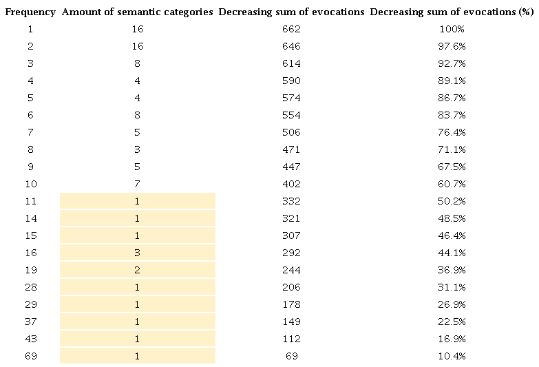 It was observed the existence of 16 semantic categories evoked only once, 16 semantic categories evoked twice, eight semantic categories evoked three times, and so on up to the highest frequency of evocation is achieved, namely 69, represented by only one semantic category.