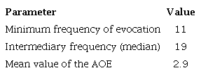 Thus, the evocation order corresponding to the position in which the semantic category was ranked by the respondent, namely the average order of evocation (AOE) of a semantic category, is none other than the mean value of the evocation orders in which all respondents evoked all words/expressions that compound the respective semantic category (Oliveira, 2007; Sá, 2002; Vergara; 2005).