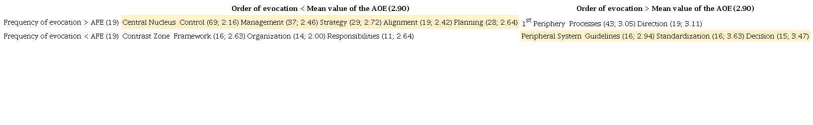 In the upper left quadrant - the categories with frequency of evocation greater than the AFE and evocation order smaller than the mean value of the AOE -, the elements that make up the central nucleus - in charge of generating the stable and organized meaning of the social representation - were placed.