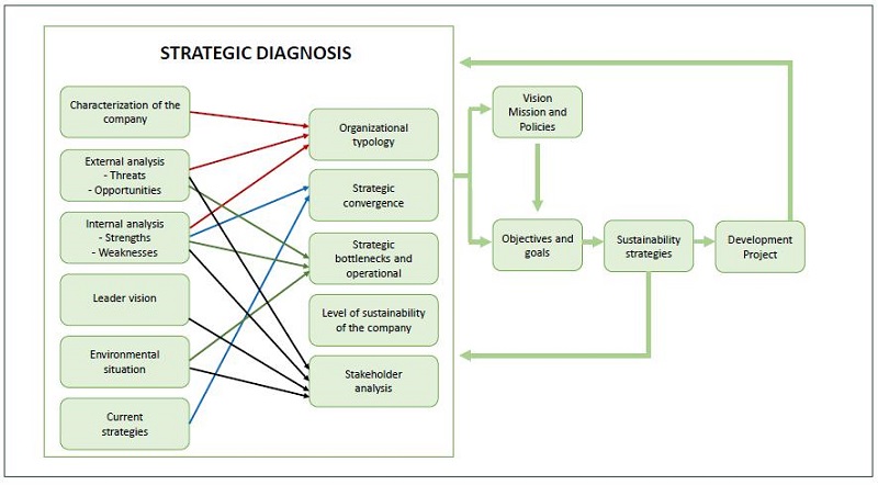 The data collection phase encompasses the steps of characterizing the company, analyzing the internal and external environment, the leader’s vision, the environmental situation, and current strategies. The analysis of data from the strategic diagnosis requires compliance with the steps of organizational architecture, analysis of stakeholders, strategic and operational bottlenecks, and the degree of sustainability of the company. Below, the steps of each phase of the model will be detailed (Coral, 2002).