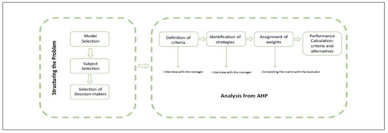 According to Saaty (1991), the AHP method was designed similarly to the way the human mind works, so when faced with a large number of elements, the human mind will consolidate them into common groups, repeating the process to aggregate them into higher groups until reaching the central objective of the problem. For the author, one of the most important steps in the decision-making process is the selection of priority factors. Saaty (1991)recommends five phases for the application of the AHP. They are structuring criteria and alternatives; collection of judgments; calculation of priorities; verification of the consistency of the decision; and calculation of the global priorities of the alternatives.