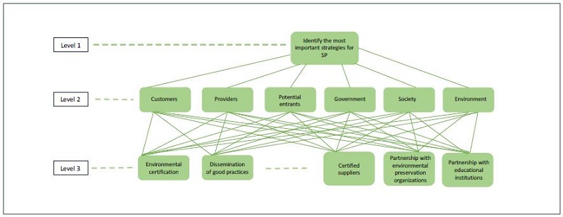 In AHP model, the problem is structured following a three-level hierarchy, in which the objective must be the initial level, the criteria the second level, and the alternatives the third level. In complex cases, more levels can be added, such as sub-criteria. In building the hierarchy, it is important to clearly define all the elements and their relationships. Based on this perspective, the following problem hierarchy was formulated: