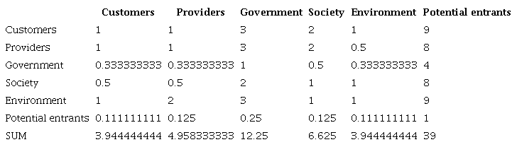 As can be seen, for the evaluator, the customers and natural environment criteria have the same degree of importance for decision-making, while the government and potential entrants criteria appear as the criteria of lesser weight compared to the other criteria. The evaluator’s judgment reinforces the information obtained in the interview.