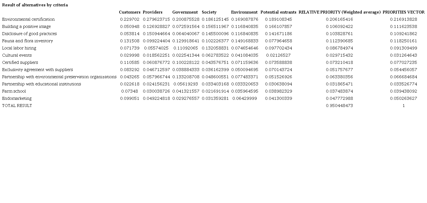 Comparisons based on the suppliers’ criterion show that the alternatives cultural events, partnership with higher education institutions, Farm School, and endomarketing had a lower degree of importance than the others did. The most important variables were environmental certification, construction of a positive image, dissemination of good practices, and fauna and flora inventory.
