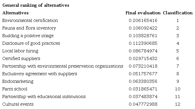 As for the analysis of the alternatives, it was seen that although there were differences between the perceptions of the production manager and the evaluator, for all criteria the alternatives that were presented as priorities were consistent with the judged criteria and the reality of the farm. Based on the results of the matrix of alternatives, environmental certification is confirmed as the focus of the company’s planning, since it is the main strategy for differentiation and positioning in a growing market. Once the relative priorities are obtained, and the consistency of the results was satisfactory, it is necessary to combine the comparison matrices of the alternatives with the matrix of the importance of the criteria. Thus, we can understand, among the alternatives, which are priorities for the organization. This combination was realized using the geometric mean method of the values obtained in the priority vectors for each criterion, thus constructing the ranking matrix, making it possible, through the mean value, to obtain the relative priority of each alternative according to the analysis carried out. Table 2 presents the performance of each alternative given the criteria used in the research.